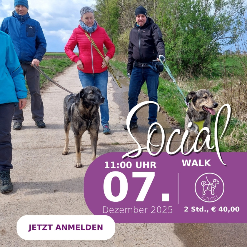 Während unseres Social Walks sollen die Hunde lernen, ihre Umwelt zu erkunden und sich trotz der anderen Mensch-Hund-Teams zu entspannen. Deshalb laufen wir langsam, machen zwischen drin auch mal kleine Pausen oder meistern kleine Übungen. Teilnehmen kann jedes Mensch-Hund-Team, unabhängig von Alter, Geschlecht oder Rasse.