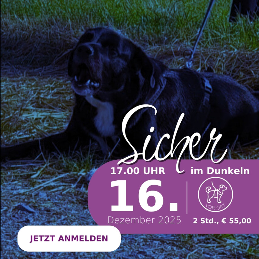 In unserem 2-stündigen Intensivtraining „Sicher im Dunkeln“ lernst Du, wie Du Deinem Hund Sicherheit gibst, ihn souverän führst und übermäßiges Schutzverhalten in ruhige Bahnen lenkst, damit aus dem Abendspaziergang wieder ein entspanntes Miteinander wird.